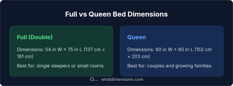 Understanding the exact numbers helps you plan a room without surprises. This section covers the dimensions of a double bed vs queen in practical terms, including standard measurements and how they translate into real space. The dimensions of a double bed (also called Full) are 54 inches wide by 75 inches long, while a queen bed is 60 inches wide by 80 inches long. In metric terms, that's roughly 137 cm by 191 cm for the Full and about 152 cm by 203 cm for the Queen. These sizes influence how many nightstands you can fit, how much clearance you have to walk around the bed, and what other furniture can coexist in the same room. According to What Dimensions, ensuring you pick the right size reduces mismatched layouts and post-purchase regret. For reference, most standard sheets and duvet covers come in both Full/Double and Queen sizes, but you should verify exact fit with your preferred brand. The rest of the article uses these baseline numbers to explore space planning, accessories, and layout.