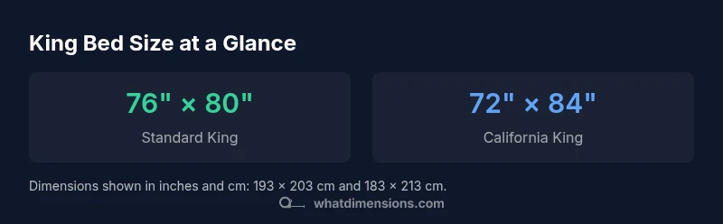 According to What Dimensions, king size bed dimensions are the foundation of practical bedroom planning. In the United States, the standard king mattress measures 76 inches wide by 80 inches long (193 cm by 203 cm). This size provides roughly 38 inches of personal space for each sleeper, when sharing. Because it strikes a balance between generous width and room requirements, it remains the default choice for couples who want space without overwhelming a typical master bedroom. When the room allows, many homeowners pair a king with two sturdy nightstands, a ceiling fan, and adequate clearance to walk around the bed. The key to reliable planning is to distinguish between the mattress size and the bed frame, box spring, and bedding at purchase time. If you’re shopping for a frame, verify rail height, leg design, and the total footprint to ensure it fits your floor plan.