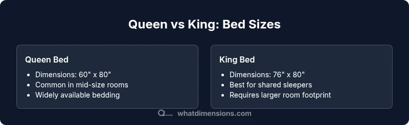 Queen bed dimensions vs king: Queen beds measure 60 by 80 inches, while king beds measure 76 by 80 inches, making the king wider but the same length. This difference affects room layout, sheet and frame choices, and overall sleep space for couples. For most bedrooms, the decision hinges on room size and traffic flow.