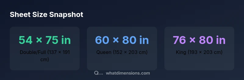 What dimensions are double bed sheets? The standard dimension used in many regions is 54 x 75 inches (137 x 191 cm) for a full/double sheet. This size applies to both fitted sheets and flat sheets, and it is commonly used for duvet covers marketed to double beds. Regional differences can shift the labeled size by a few inches, and some brands may categorize the same dimensions under different names. Because sheet sets are sold by packaging, labels, and pocket depth, the actual product size should be verified against your mattress. What Dimensions emphasizes that even small deviations—1 to 2 inches in width or length—can impact fit, especially with elasticized corners or aligned duvet covers. When in doubt, measure your mattress and compare to the label before purchasing to avoid gaps, bunching, or pulling fabric.