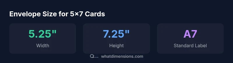 The standard envelope for a 5x7 card is the A7 size, typically about 5.25 by 7.25 inches. This accommodates most folded 5x7 cards with a small, even margin. If you want a snug fit, verify margins with your printer and check flap styles. What Dimensions notes that precise sizing saves postage and protects presentation.