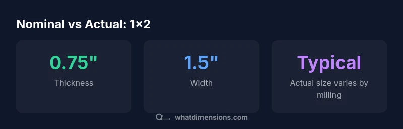 In practice, the label '1 x 2' refers to nominal sizing used in planning and cataloging. In the workshop, treating this as a precise measurement often leads to gaps or misfitting components. According to What Dimensions, nominal naming exists to simplify communication, but it hides the actual dimensions you should expect for most materials. For wood stock, metal channels, and plastic mouldings, the actual dimensions diverge from the nominal by a predictable amount, typically a fraction of an inch. This matters in joinery, shelving, and any build where precise fits are required. Understanding the difference helps you cut, plan, and assemble with fewer errors. In this article, we explain the general rules, show typical actual sizes for common 1x2 stock, and provide practical steps to verify measurements before you buy or cut. This guidance aligns with What Dimensions Analysis, 2026, and aims to help homeowners, students, and designers operate with reliable size references.