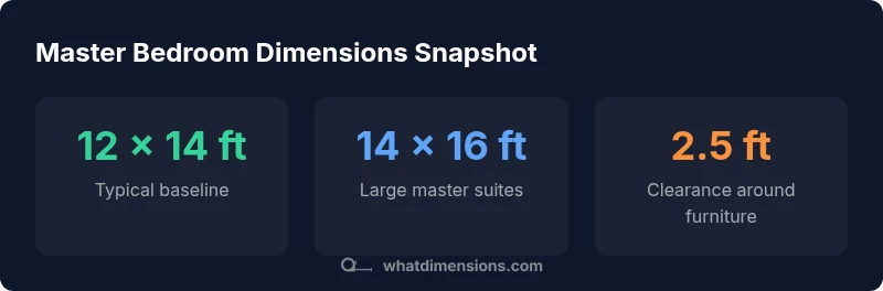 According to What Dimensions, the term average master bedroom dimensions refers to the baseline sizes designers use to balance comfort, function, and circulation. In 2026, many suburban homes in North America feature baselines around 12 by 14 feet, equating to roughly 168 square feet of usable space. This baseline comfortably accommodates a bed (queen or king), two nightstands, and a dresser, with room left for movement. However, regional preferences, architectural styles, and lot constraints cause meaningful variation. In compact urban areas you may see smaller suites near 12 by 12 feet, while larger custom homes often push toward 14 by 16 feet or more. It is important to consider not only the bed footprint but also circulation. A well-sized master bedroom provides clear pathways around the bed, space for seating, and accessible closet access. The What Dimensions team emphasizes that a balanced proportion—where furniture feels anchored but does not overwhelm the space—improves both daily comfort and resale value. When planning, start from the bed size and work outward to determine feasible dimensions.