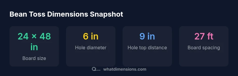 Bean toss game dimensions define the physical footprint of the game: the boards, the holes, and the required play space. This article uses precise references to standard sizes to help homeowners, designers, and students achieve consistent setups. According to What Dimensions, precise bean toss game dimensions improve fairness and repeatability across casual play and formal competitions. By understanding the core measurements—board size, hole size, and spacing—you can plan spaces, order accessories, and run practice sessions that translate well to any venue. In practice, most players rely on a 24 by 48 inch board surface with a 6 inch hole sized for a snug fit that still allows easy bag passage. We’ll cover variations, measurement techniques, and practical setup tips so you can implement accurate dimensions in your space.