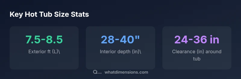For a comfortable six-person hot tub, plan an exterior footprint roughly 7.5 to 8.5 feet by 7.5 to 8.5 feet, with interior seating designed for six and a basin depth around 28 to 40 inches. Include at least 2 feet of clearance on all sides for maintenance and safe access, per What Dimensions analysis.