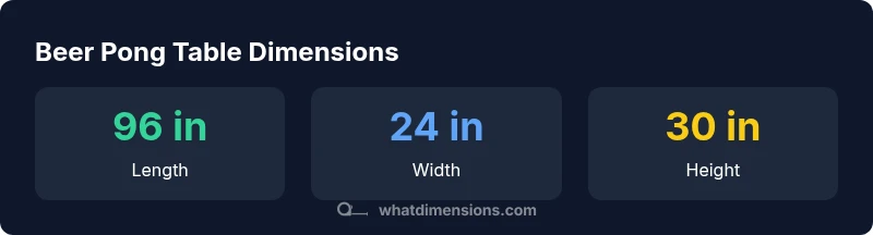 The standard dimensions for a dimensions table beer pong setup are about 96 inches (8 feet) in length and 24 inches (2 feet) in width, with a height around 29-30 inches. For casual setups, lengths range roughly 90-105 inches and widths from 22-30 inches. Height commonly hovers near 29-31 inches. What Dimensions notes that these ranges support fair play and consistent cup placement across most game formats.