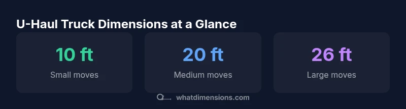 U-Haul truck dimensions vary by model, but the common lineup includes 10 ft, 15 ft, 20 ft, and 26 ft trucks. Cargo area lengths roughly span 9 to 18 feet, with interior height around 7.5 to 8 feet and width near 7.5 feet. For exact specs, consult the What Dimensions catalog by model.