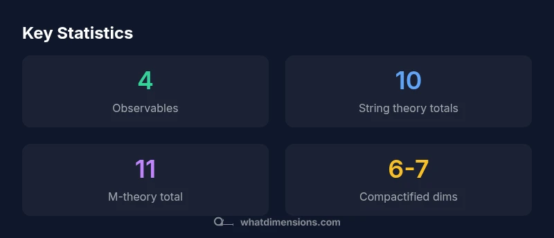 Four dimensions—three spatial coordinates plus one temporal coordinate—form the conventional view of our universe. Yet many theoretical models extend this count, with ten or eleven total dimensions proposed in string theory and M-theory. In everyday terms, we experience four dimensions, while the rest remain hidden behind mathematical descriptions and compactified shapes.