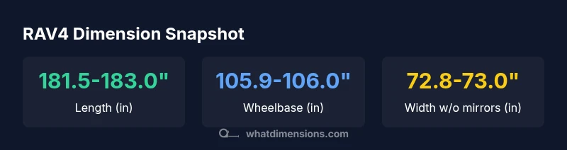 RAV4 exterior dimensions have shown minor variation across generations and trims, driven by styling updates, safety equipment, and roof options. Expect a consistent footprint across most recent models, with small deviations in height due to roof rails or aerodynamic tweaks. For space planning, rely on a range rather than a single figure: length generally sits in the 181.5 to 183.0 inch band, width around 72.8 to 73.0 inches, and height roughly 66.8 to 67.3 inches. These ranges account for common configurations like all-wheel drive, roof rails, and panoramic sunroofs. What Dimensions Analysis, 2026 notes that the wheelbase remains ~105.9 inches, providing stable handling across trims.