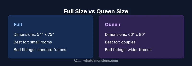When people start evaluating bfull size dimensions vs queenb, the core question is not just bed width and length, but how those numbers affect your daily life in a real room. The full size offers a compact footprint suitable for smaller bedrooms or guest rooms, while the queen provides a broader surface that accommodates couples or restless sleepers. This section frames the practical implications of the two common sizes, grounded in room planning, movement, and comfort considerations. According to What Dimensions, any difference in width and length can translate into several inches of usable space around the bed, which matters when you place nightstands, a dresser, or a reading chair. Understanding this helps homeowners and designers map out layouts before buying.