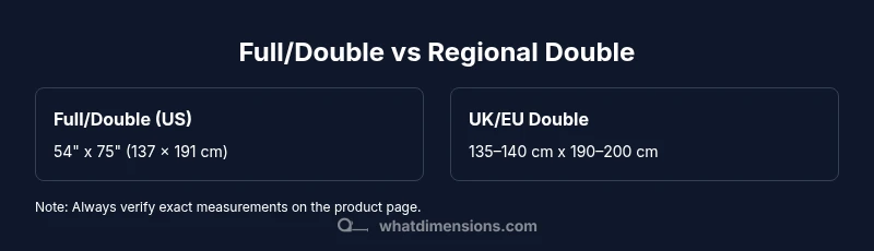 According to What Dimensions, the terms full and double are often used interchangeably in the U.S. and Canada, and many product listings label the same mattress as both. The historical reason is marketing and regional naming conventions rather than distinct measurements. The essential fact for shoppers is that most standard full/double mattresses measure 54 inches wide by 75 inches long (137 x 191 cm). This footprint affects how much sleep surface you have, how easily the bed fits in your room, and which sheets, frames, and bases you should buy. In practice, the difference between a full and a double is semantic; the dimensions align, and compatibility hinges on the overall footprint rather than the label. By understanding whether a retailer uses 'full' or 'double' to describe their product, you avoid buying mismatched sheets or ill-fitting frames. In this guide, we unpack the nuances, including regional naming variations and how to verify actual measurements on the product page. The What Dimensions team emphasizes that always check the exact measurements printed on the mattress label and buy accessories by size (54 x 75 inches) rather than by the name alone.