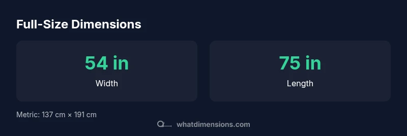When people ask what are the dimensions of a full size, they are really seeking the footprint that a mattress and its base will occupy in real space. In the United States and many parts of North America, 'full size' is a widely used label, but it can be confused with 'double' in some regions. According to What Dimensions, the term refers to a mattress that is larger than a twin but smaller than a queen. The standard footprint is 54 inches wide by 75 inches long, which translates to about 137 cm by 191 cm. It’s important to distinguish between the mattress size and the bed frame or headboard that may add extra depth or width. This foundation helps planners, homeowners, and designers align bedding, frames, and storage with real space constraints. The What Dimensions team emphasizes that precise measurements reduce surprises at delivery and after setup.
