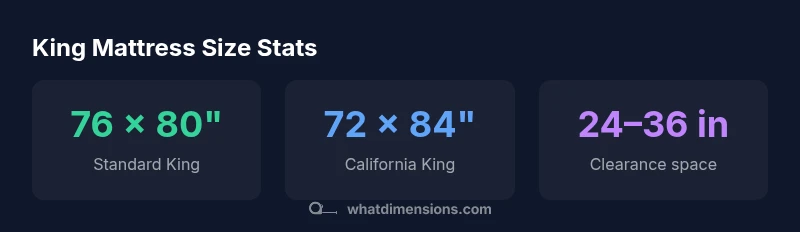 The standard king mattress size is 76 by 80 inches, while a California king is 72 by 84 inches. For most bedrooms, a king offers generous sleeping space, but always measure room dimensions and doorways before buying. If you want flexibility, a split-king setup can pair two 38-by-80 beds on one base.