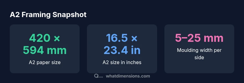 The key measure for an A2 frame starts with the paper size: 420 × 594 millimeters. When selecting a frame, account for the frame’s moulding width and any mat border, which increase the outer dimensions beyond the paper size. In practice, choose a frame with an outer size comfortably larger than 420 × 594 mm to allow for secure mounting and avoid edge contact.