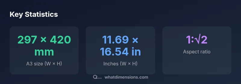 A3 measures 297 × 420 mm, which is 11.69 × 16.54 inches. It preserves the 1:√2 aspect ratio that all ISO A-series sizes share.