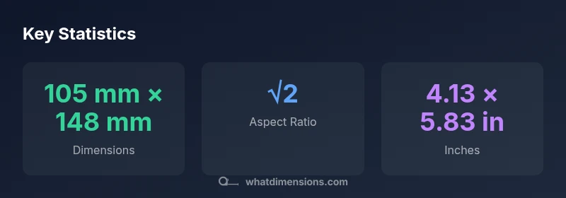 A6 is 105 mm by 148 mm. This is defined by ISO 216 and used for postcards, notes, and small-format prints. The standardized size supports consistent layouts and trimming.