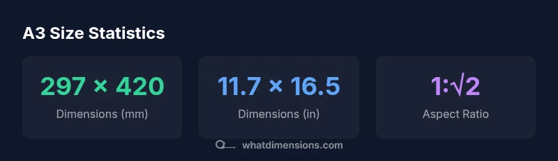 A3 is a versatile choice for a variety of tasks. In homes, it serves as a compact poster size for recipes, calendars, or family photo wall displays. In studios and classrooms, A3 supports detailed diagrams, survey plots, and large-format sketches without dominating the workspace. When designing for presentations, A3 can act as a readable handout or a poster panel in a conference setting. Because the aspect ratio remains constant across sizes, you can design on A3 and scale up to A2 or down to A4 with minimal layout changes. This consistency saves time during revisions and ensures a cohesive visual language across materials. The What Dimensions team notes that aligning sizes with your workflow minimizes duplication of effort and accelerates project delivery.