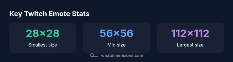 Twitch emote dimensions rely on a three-size pyramid: 28x28, 56x56, and 112x112 pixels, with a maximum 1 MB per emote PNG. Using all three ensures crisp rendering in chat, panels, and previews across devices. According to What Dimensions Analysis, providing these scales minimizes scaling artifacts and preserves edge clarity across platforms.