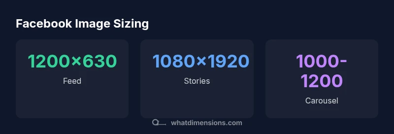 Key sizing for Facebook posts: Use 1200 x 630 pixels for standard feed images (aspect ratio 1.91:1). For Stories, publish at 1080 x 1920 pixels (9:16). Carousel images should maintain 1,000–1,200 px width with consistent aspect ratios; save as JPEG or PNG under 2 MB. These sizes balance clarity, load speed, and platform compression.